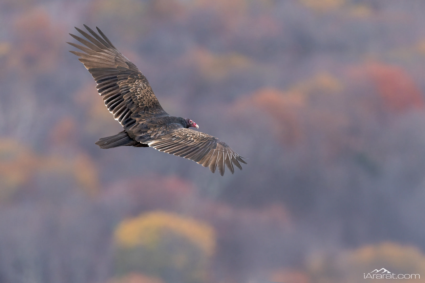 At the top of Millbrook Mountain in Minnewaska State Park Preserve, standing at 1,600 feet, I witnessed an extraordinary moment. A Turkey Vulture flew slightly below my level, offering a rare and breathtaking perspective. Its wings were fully spread, and the intricate details of its feathers were visible in every curve. The soft light of autumn illuminated the background, filled with vibrant hues of orange, yellow, and green evergreens, creating a stunning contrast.