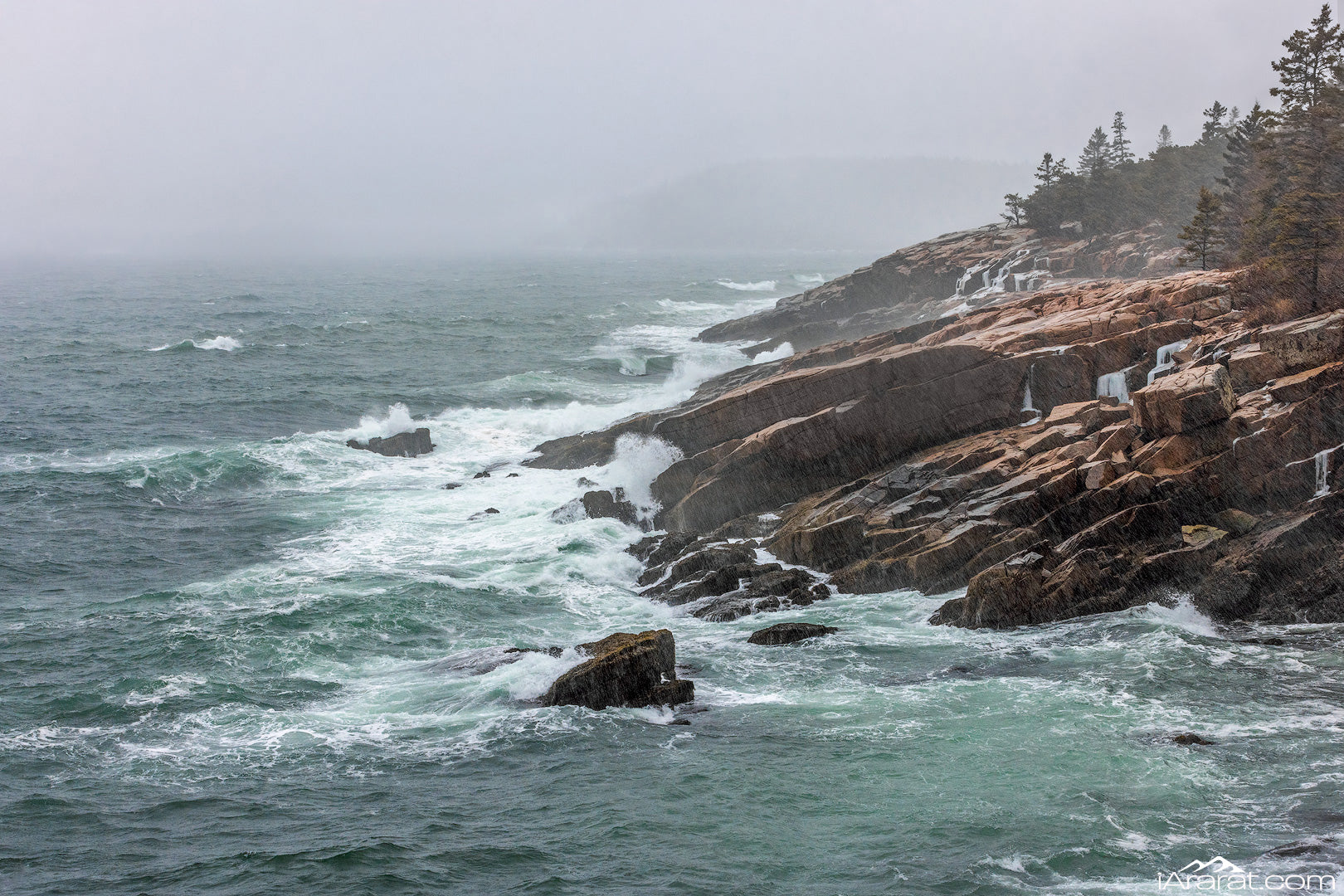Captured on the rocky shores of Acadia National Park during a winter storm. Waves crash against the cliffs, emerald-green water churns below, and cold rain and mist shroud the dramatic landscape.