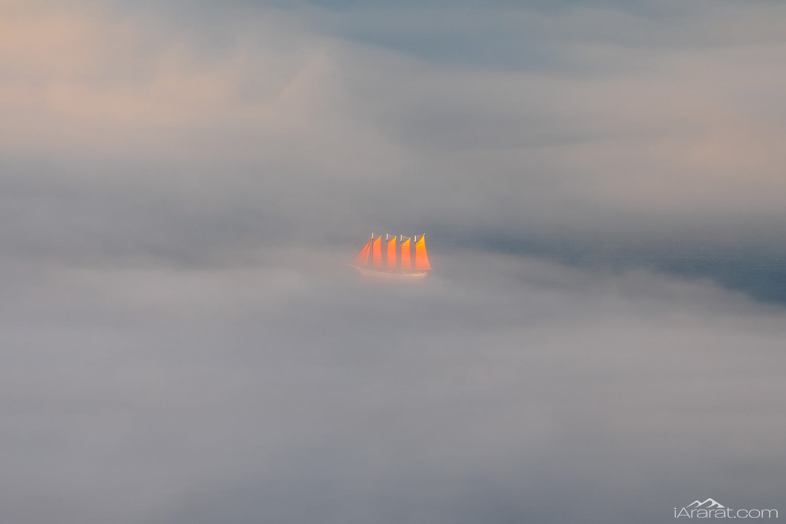 A vibrant image of red sails cutting through the clouds at sunset, symbolizing freedom and adventure.