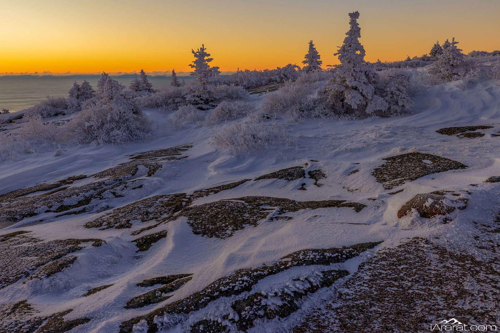 At the summit of Cadillac Mountain, the landscape stands still in anticipation of sunrise. The fiery glow of dawn has faded, leaving behind a soft golden radiance in the sky. The wind has swept away some of the snow, revealing the rugged rocks in the foreground. Snow-covered firs and shrubs create a delicate contrast in the middle ground, while the distant ocean stretches to the horizon, beneath a thin band of clouds. The entire scene is bathed in gentle white and golden hues, evoking a sense of peace and quiet.