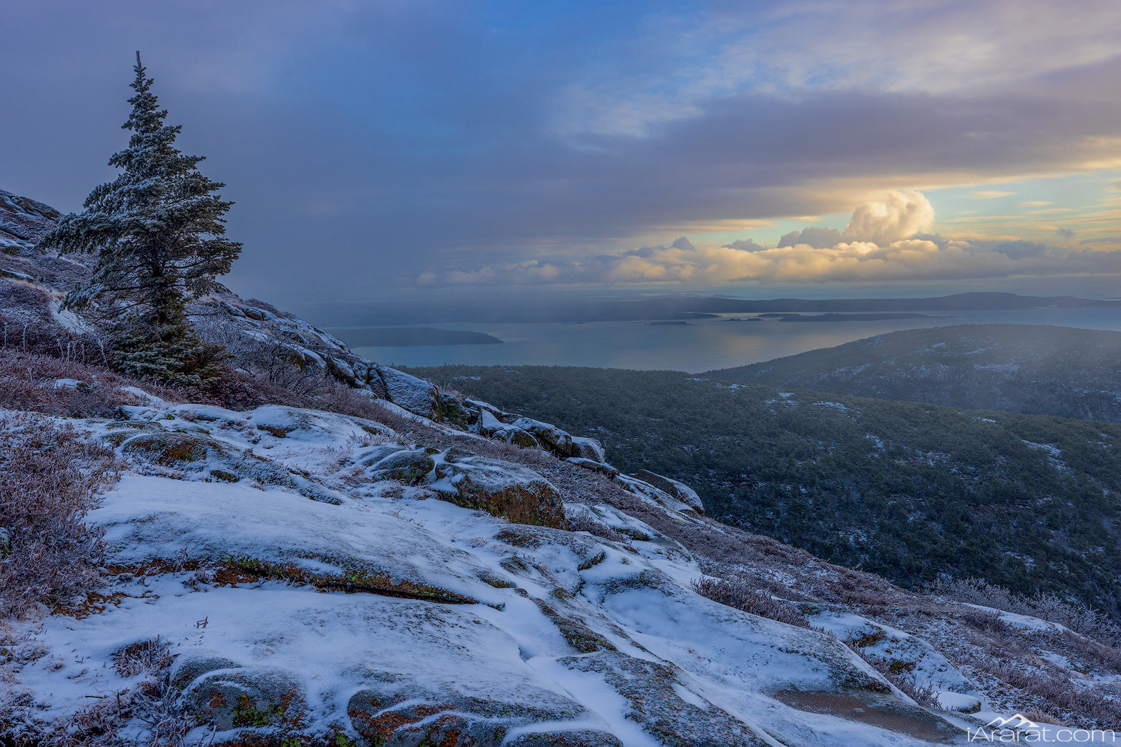 On the slopes of Cadillac Mountain, a gentle winter scene unfolds: a lightly snow-dusted rocky hillside with a lone pine tree contrasting against the smooth lines of hills and the ocean. Islands, veiled in haze, and softly illuminated clouds evoke a serene sense of calm.