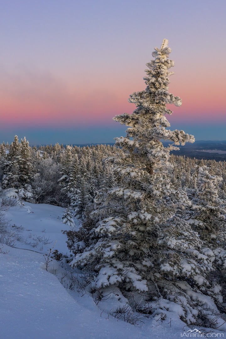 An early winter morning atop Cadillac Mountain in Acadia National Park. Frost-covered fir trees stand still in the pre-dawn light, painted in soft pink and blue hues. The cold, silence, and vast open spaces create a sense of solitude and the grandeur of nature. This scene is a reminder of the beauty of winter’s stillness and the magic of the first rays of a new day.