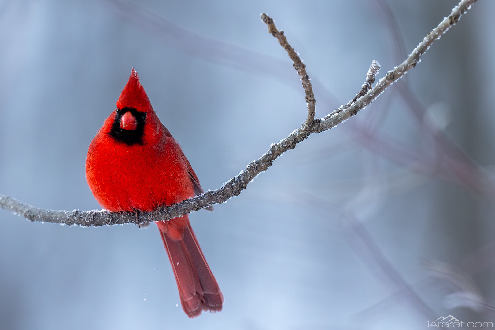A vibrant cardinal perches on a frost-touched branch, staring straight into the frame. Its scarlet plumage glows against the quiet chill of winter — a moment of strength and stillness.