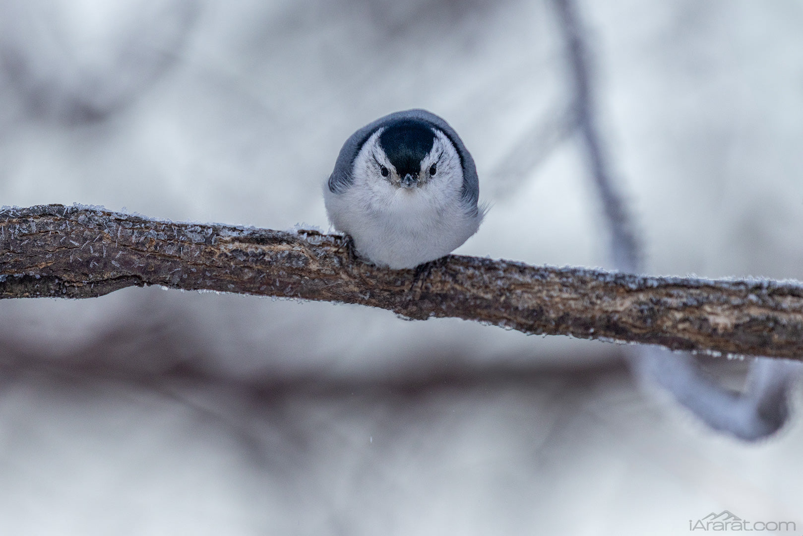 A white-breasted nuthatch perches on a frost-lined branch, gazing ahead with quiet intensity. Fragile yet focused, it fills the frame with stillness and presence.