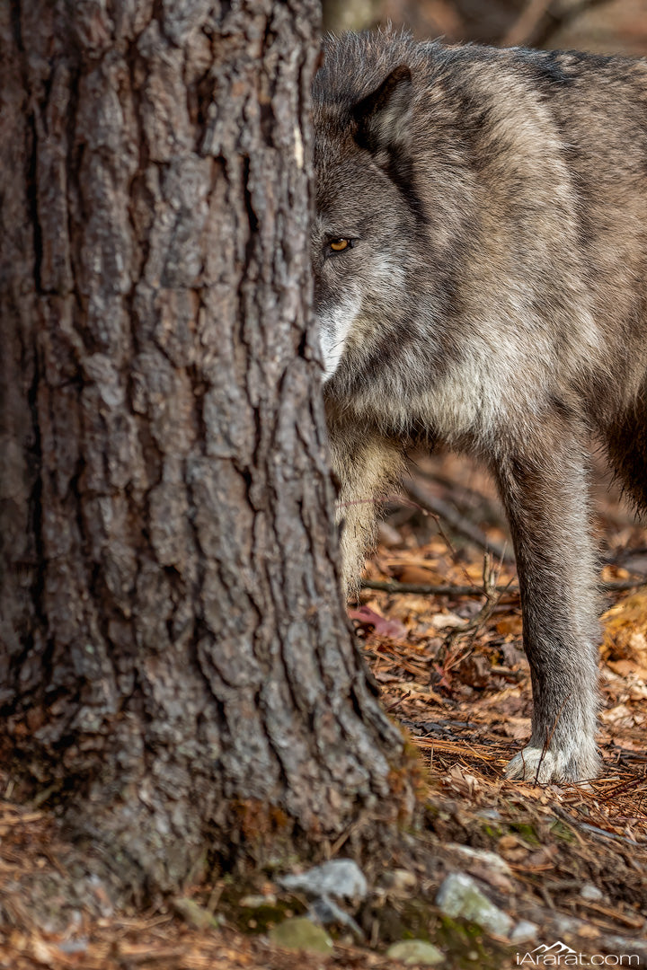 Though not entirely hidden behind the tree, the wolf’s coat blended perfectly with the forest. He remained nearly invisible — until he began to move from tree to tree.