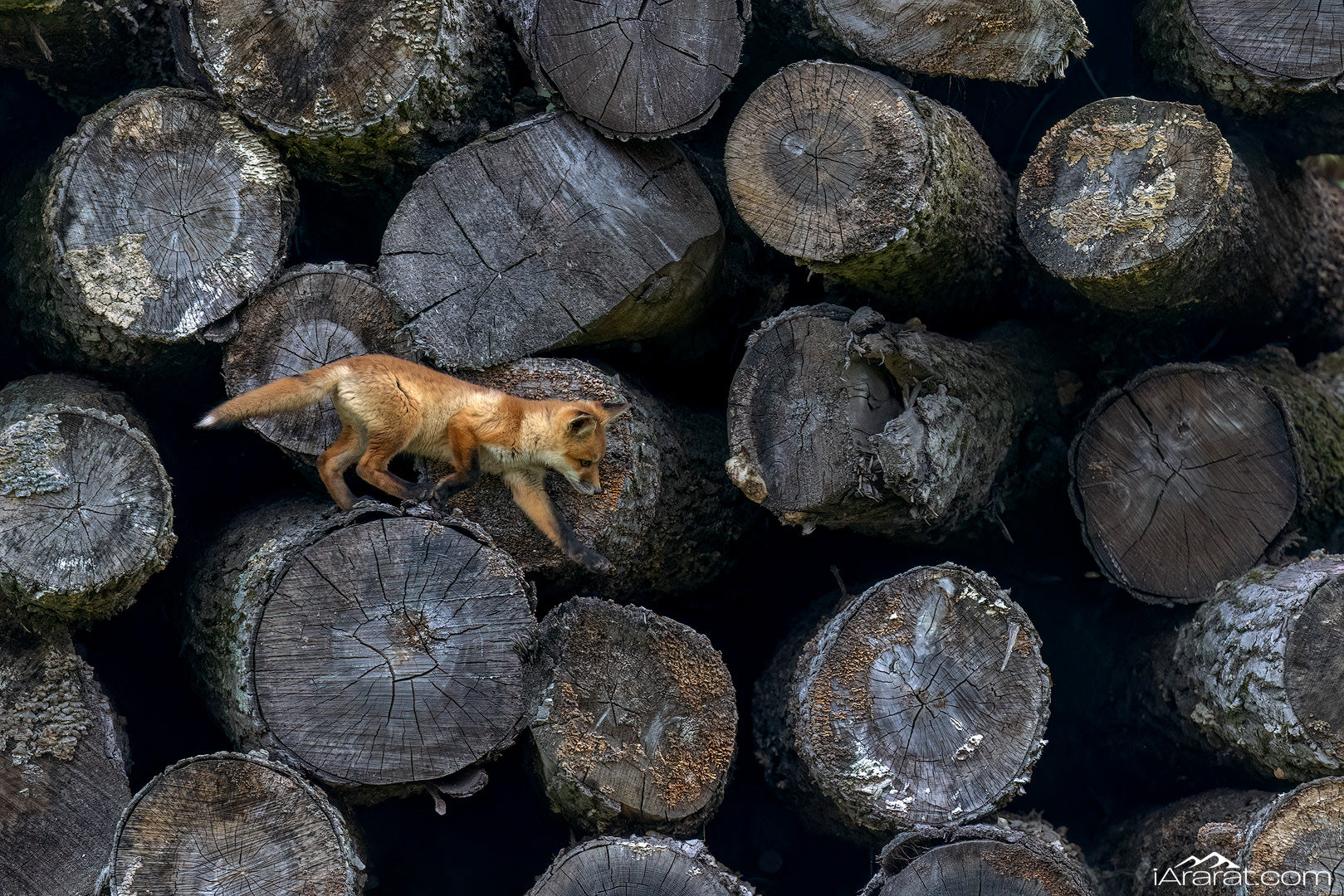 A curious fox walks a narrow path across a wall of timber — alert, graceful, and perfectly in balance with its surroundings.