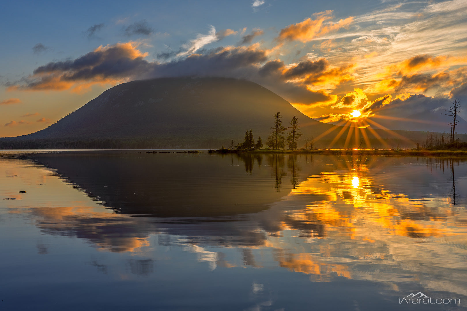 Morning in the Maine wilderness — calm waters of Spenser Pond reflect the golden light of dawn, the mountain rising in the distance under soft clouds.