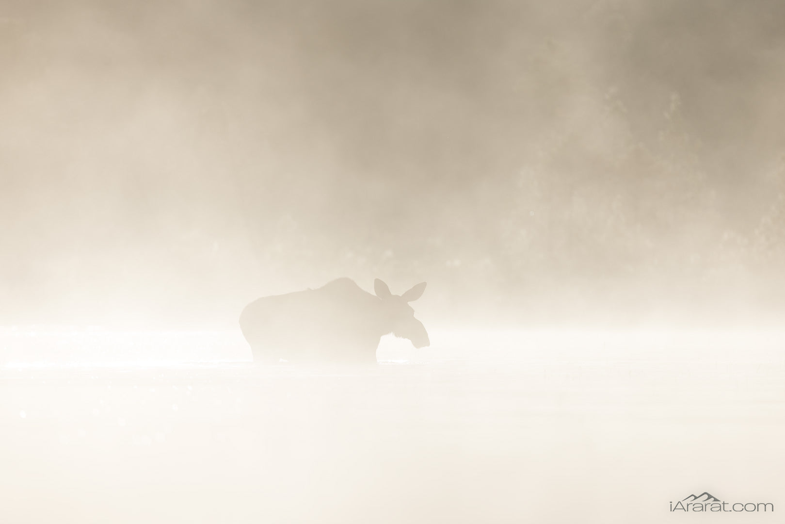 At sunrise, a moose slowly emerged from the dense morning fog, its shape barely visible — a fleeting silhouette in the mist.