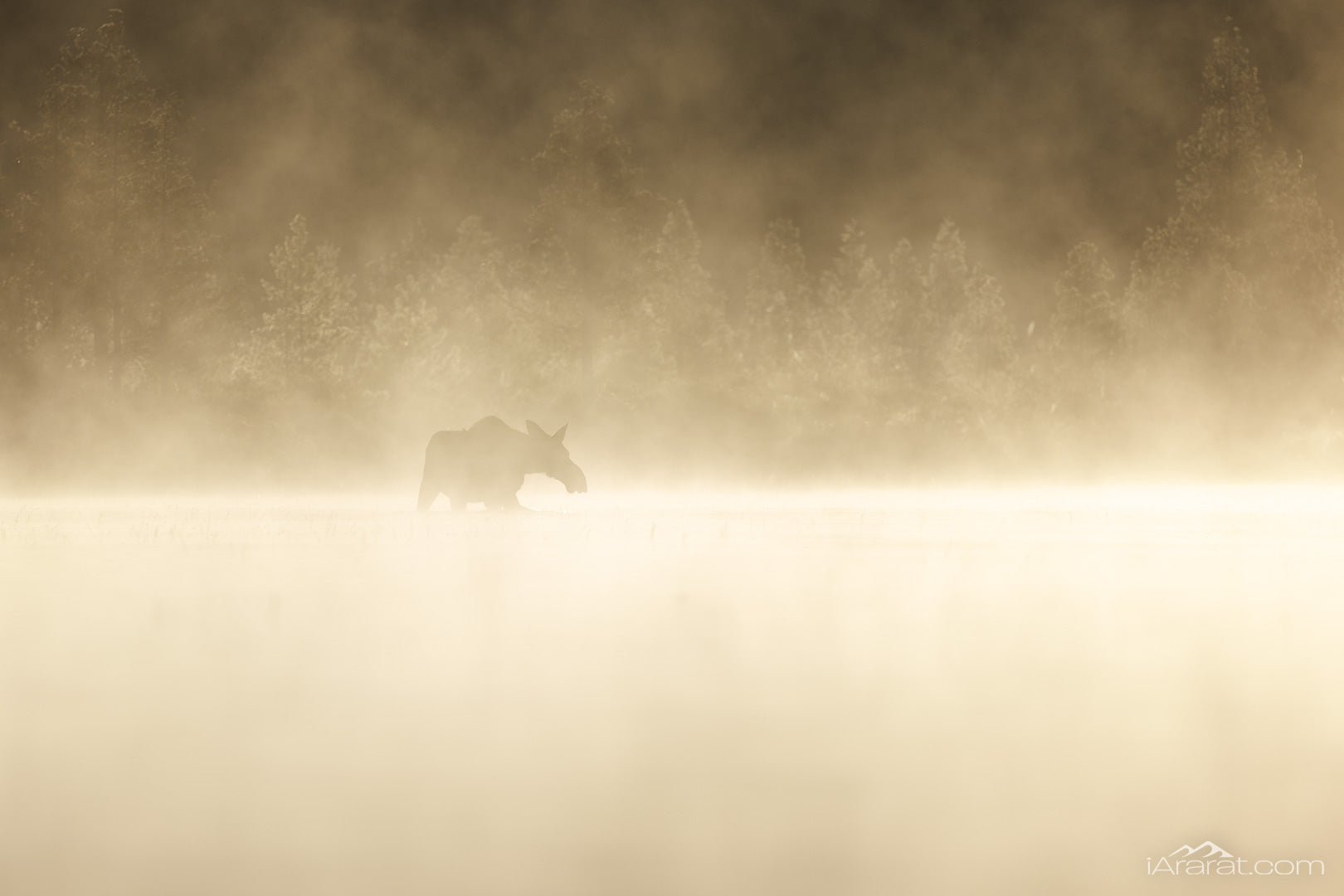 At the break of dawn, the moose appeared like a phantom, its figure dissolving into the golden fog. The silence of the morning lake was broken by the rhythm of its steps, the splash of water, and the quiet sound of grazing — a fleeting encounter between wilderness and light.