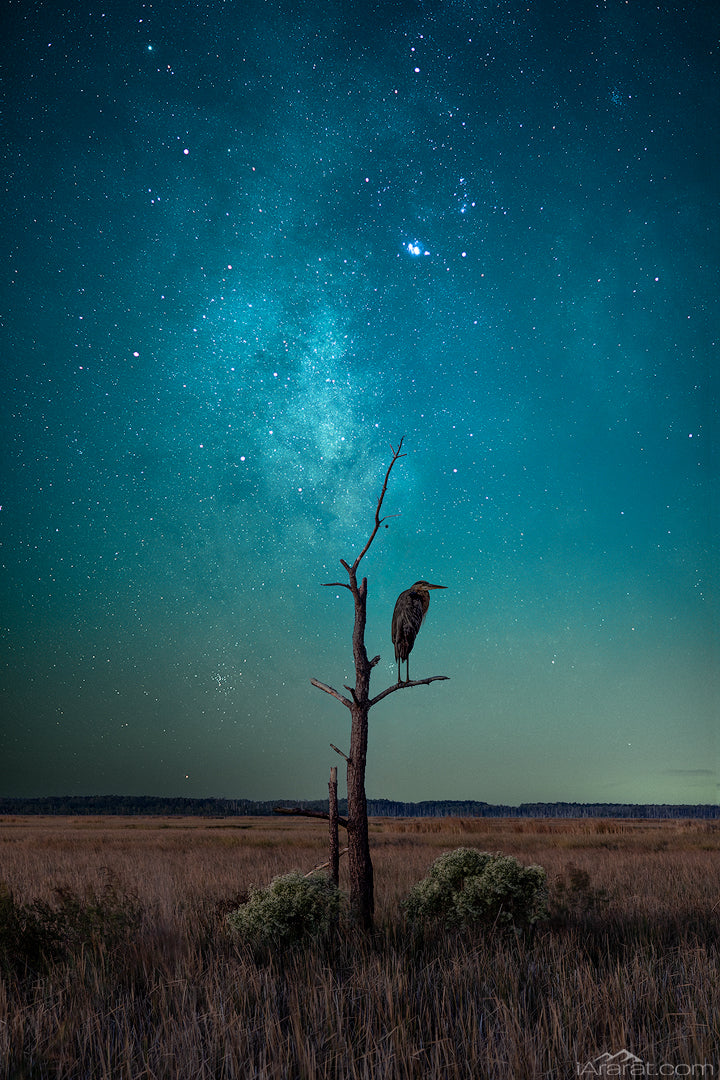 A rare sight of the Milky Way above a solitary Great Blue Heron, blending the heavens and nature in one frame.